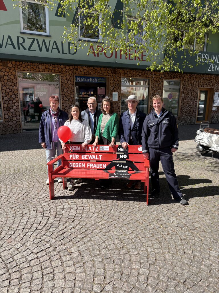 Seit Anfang April steht unsere Rote Bank in Elzach am Nikolauplatz. Am 22.04.2026 wurde sie dort in einer kleinen Veranstaltung vom Elzacher Bürgermeister, der Ortsvorsteherin von Oberprechtal, der Polizei, Beratungsstellen sowie vom Gewerbevereins gewürdigt. Die Stadt Elzach setzt damit ein wichtiges Zeichen gegen Häusliche Gewalt. Wir freuen uns über das Interesse!